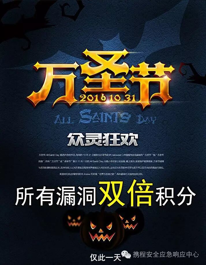 凡在2016年10月31日在CSRC平台(https://sec.ctrip.com/提交携程相关漏洞或威胁情报,所有提交漏洞或威胁情报的白帽子经审核通过后均可获得双积分,且期间提交漏洞数量排名第一的白帽子将获得万圣节神秘礼物一份。漏洞或威胁情报双倍奖励以提交时间为准 。(活动时间仅此1天